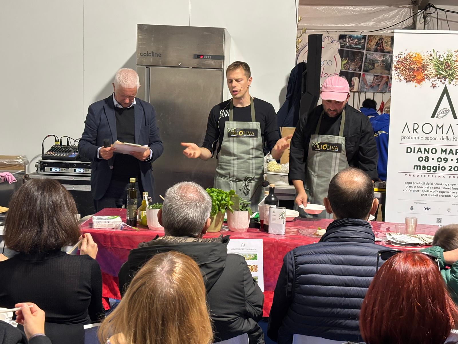 Folto pubblico anche per il brillante cooking show proposto dagli chef Luca Mercurio del Mercurio Restaurant di Diano Marina e Ivan Biancardi del Surf di Imperia, un percorso di assaggi in cui l’olio extra vergine di oliva è stato protagonista di ogni piatto, tra tradizione e sperimentazione: il branda montato all’olio su waffle stroscia all’olio extra e basilico, un pan di Spagna all’olio nuovo con gelato all’olio evo, marmellata di olive e salvia al cioccolato, e infine una panna cotta alle olive con sansa di olio, sale e timo limone.
